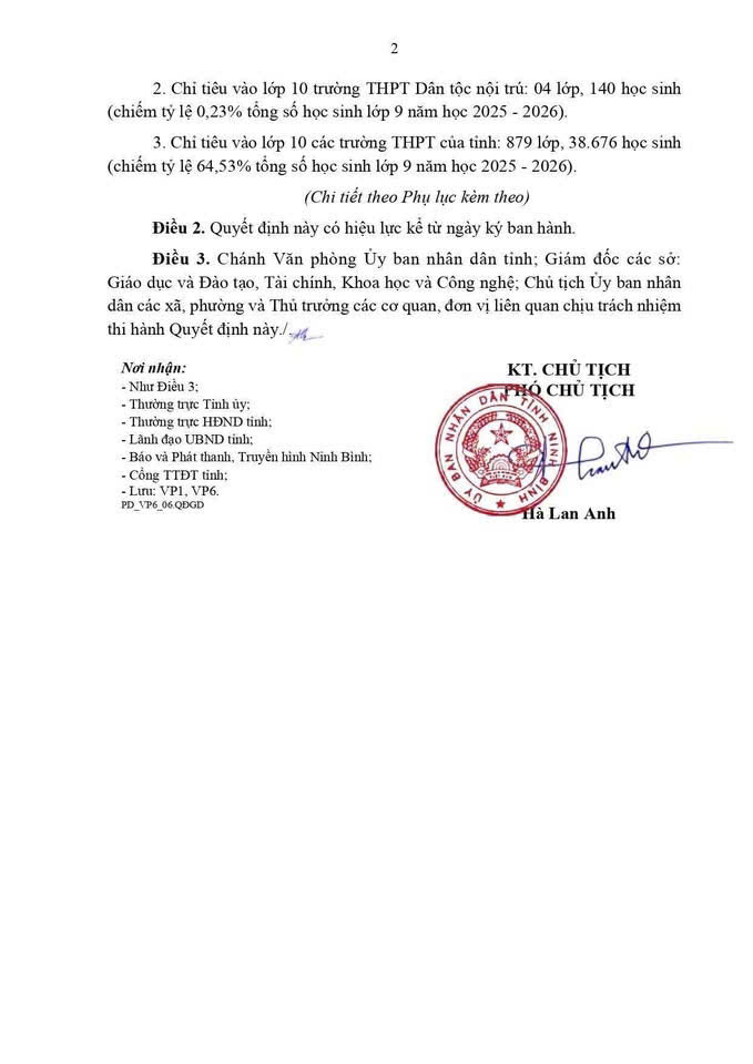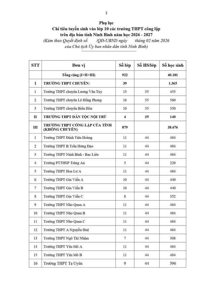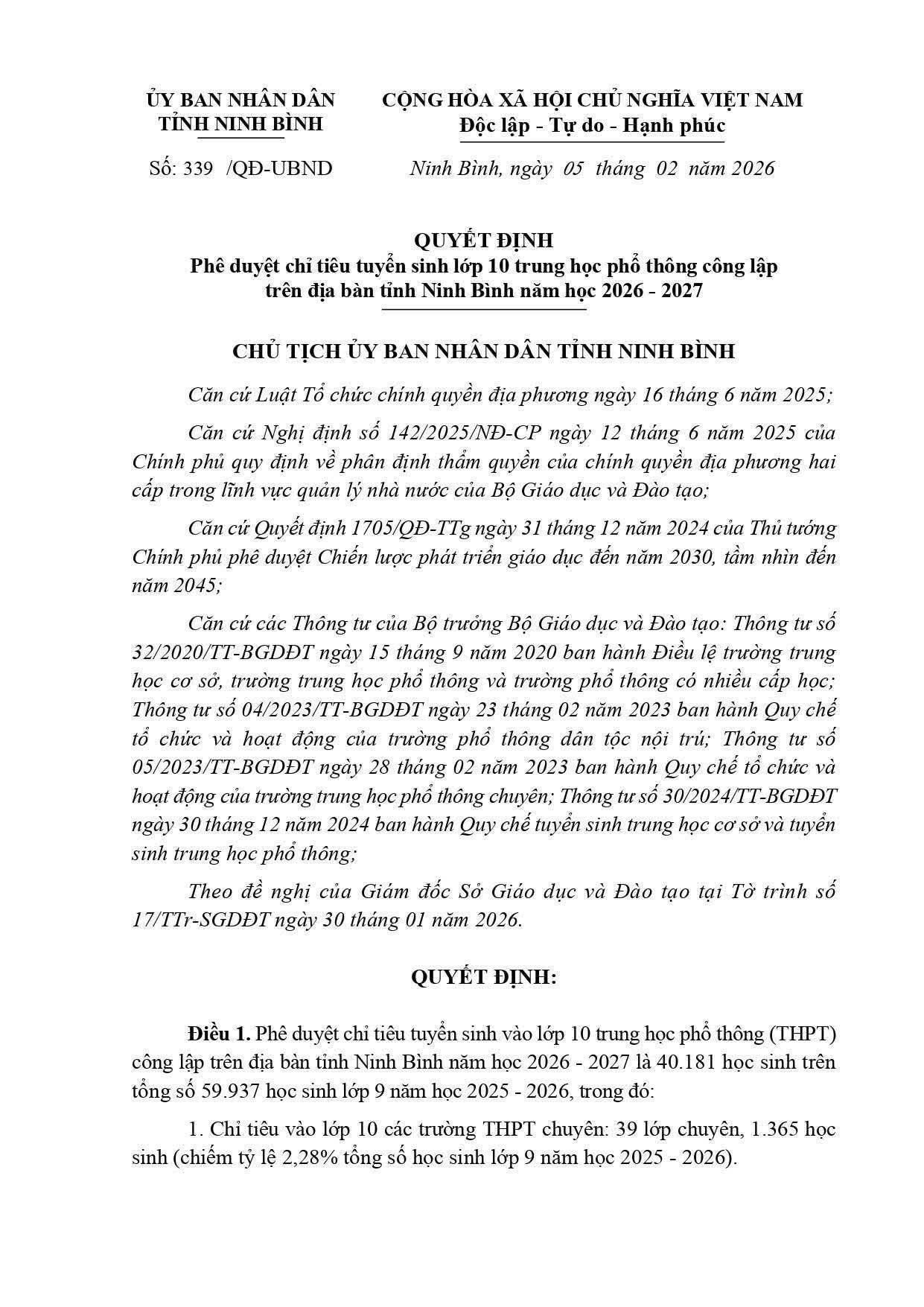 Chỉ tiêu tuyển sinh lớp 10 trung học phổ thông công lập trên địa bàn tỉnh Ninh Bình năm học 2026 – 2027.