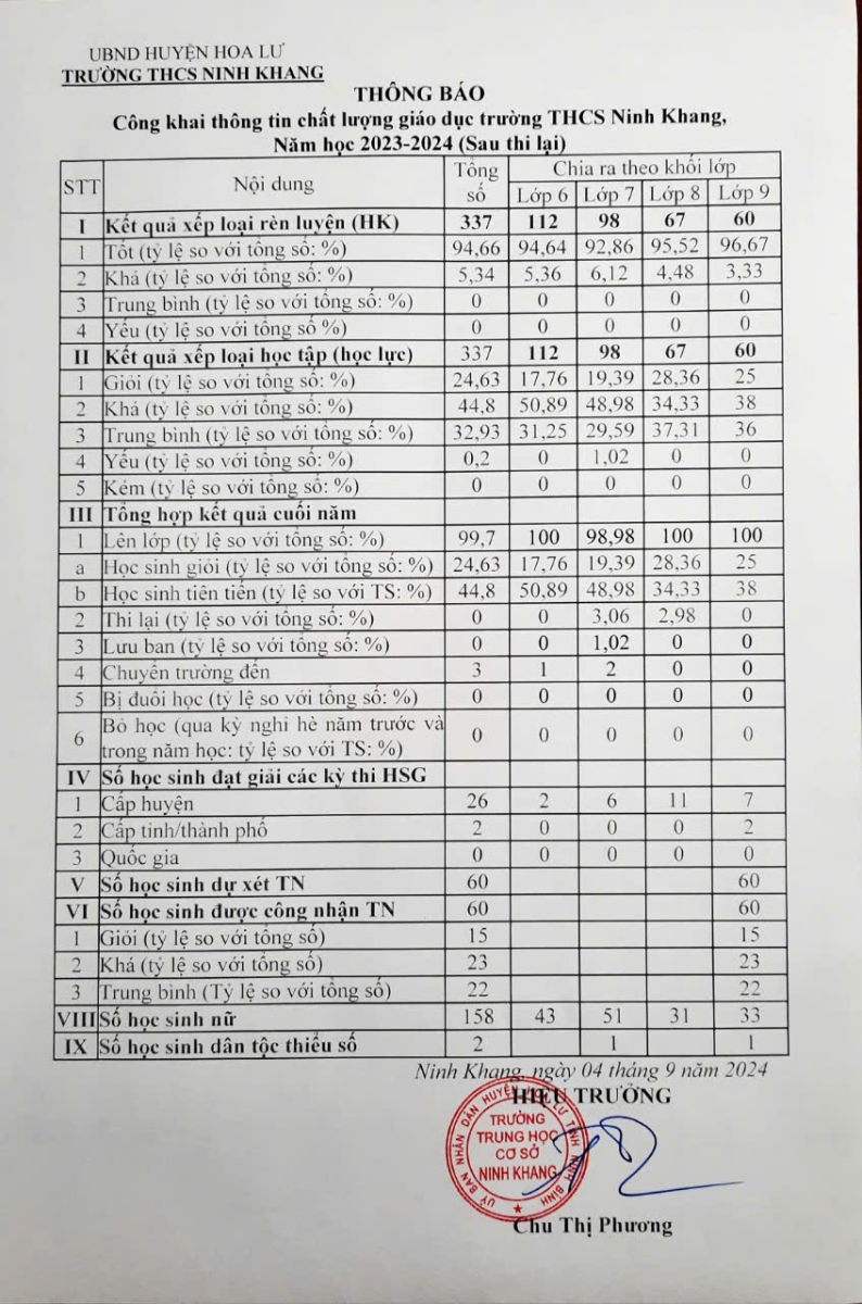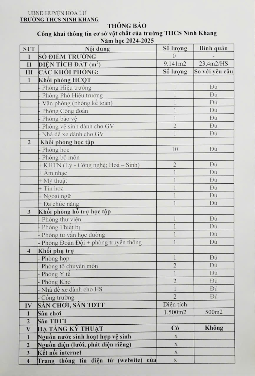 Công khai thông tin CSVC của trường THCS Ninh Khang năm học 2024-2025
