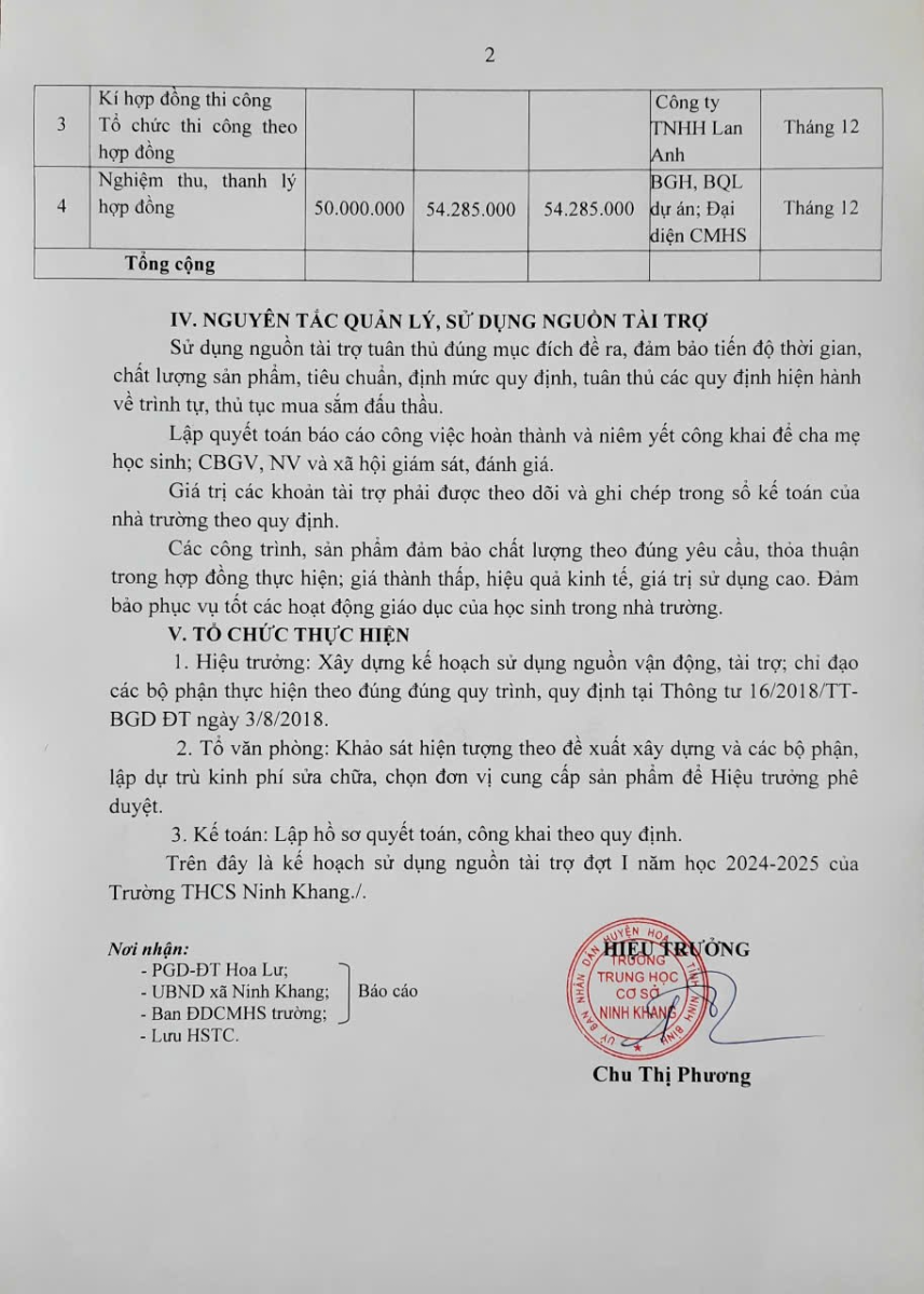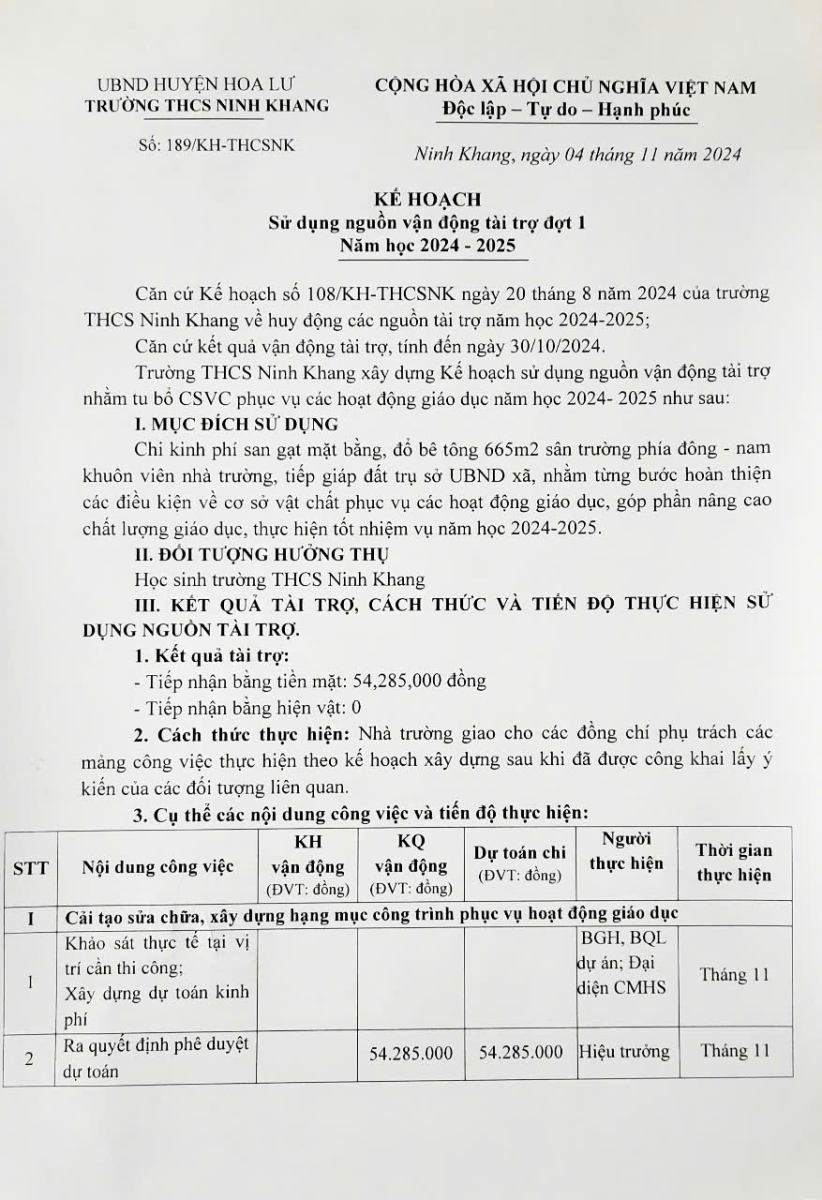 Kế hoạch thực hiện các khoản thu năm học 2023 – 2024