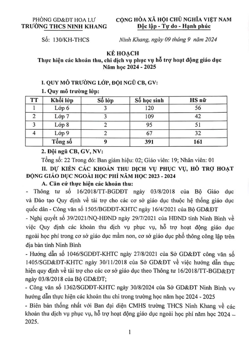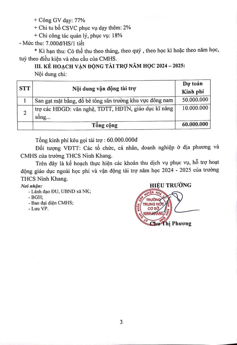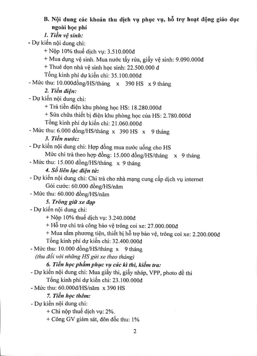 Kế hoạch thực hiện các khoản thu – chi dịch vụ hỗ trợ HĐGD năm học 2024 – 2025