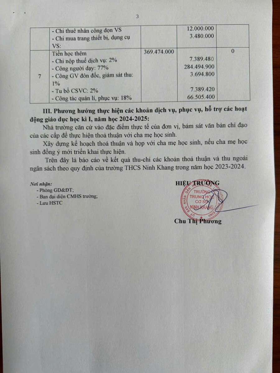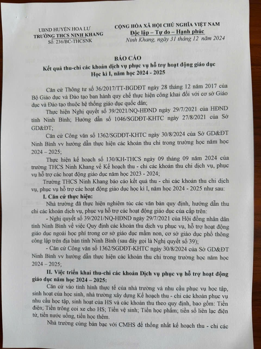 Kết quả thu – chi các khoản dịch vụ hỗ trợ hoạt động giáo dục học kì I, năm học 2024 – 2025